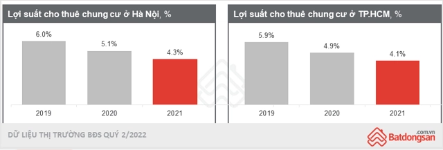 Cũng theo trang này, lợi suất cho thuê chung cư Hà Nội và TP HCM đã giảm liên tiếp trong 3 năm trở lại đây. Vào năm 2021, con số này lần lượt đạt 4,3% và 4,1%, ước tính chỉ bằng 50% so với thời kỳ đỉnh cao (khoảng 2017 – 2018).